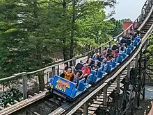 Thunder Run operated until the end of the 2009 season which ended on November 1. On February 4, 2010, amid a corporate bankruptcy, Six Flags closed the park due to the rejection of an amended lease by the Kentucky State Fair Board.[5] Eventually, on June 27, 2013, a group of investors led by Ed Hart negotiated an agreement to reopen the park with a planned investment of $50 million.[6] Rocky Mountain Construction was hired to refurbish the coaster,[7] resulting in replacement of the existing wooden track.[8][9] On October 10, 2013, Kentucky Kingdom invited members of the media and amusement industry to ride the refurbished Thunder Run. The ride reopened to the public on May 24, 2014.[9] After the 2016 season, Kentucky Kingdom announced that Thunder Run would receive a new train from the Philadelphia Toboggan Company for the 2017 season. This train replaced the single train that was first put into service in 1990.[10]