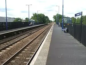 The two wooden platforms each have a shelter and passenger information notice boards.[2] It is not staffed and has a single ticket machine on the north-bound platform, meaning passengers are expected to purchase their tickets, then traverse two long ramps and the railway bridge if they wish to travel southbound. Though there is step-free access from the car park onto the platforms, Northern's station information page states that it is unsuitable for use by disabled passengers.[3] The cycle racks are also somewhat secluded and have low security.