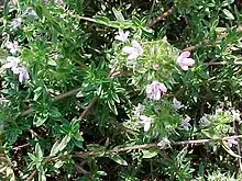Caraway thyme contains an essential oil and the plant has antiseptic, deodorant and disinfectant uses. It also has uses in perfumery, as a mouth wash and as a traditional medicine.[2] A study undertaken to compare the essential oil with similar oils from two other members of the genus found that all three had similar antimicrobial activities against gram-positive bacteria and against mycetes as compared to the well known antiseptic chlorhexidine gluconate.[3]