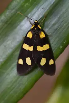 Its frontwings are black-brownish with 5 yellow spots, the wingspan is 26 mm.[2]
