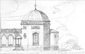 Tyszkiewicz family member, Feliks Tyszkiewicz, contacted famous German architect Franz Heinrich Schwechten to construct a new palace; their old estate was a wooden manor on the banks of Rąžė River.[1] The first stage of construction lasted until 1897, consisting of the terrace and main residence building. The two-story building had regular form with an arched terrace, decorated with sculptures from France. Although mainly Italian neo-Renaissance in style, it also has neoclassical and baroque elements. Because in 1907 his wife, Antonina, delivered a healthy baby boy (Stanislaw) after a worrisome pregnancy, Feliks commissioned a sculpture of the blessing Jesus for the front of the palace. While the creator of this sculpture is unclear, there is evidence it was made by Danish artist Bertel Thorvaldsen or his apprentice.[2] In 1948 the religious sculpture was torn down under the instructions by the Lithuanian communist authorities. It was reconstructed based on surviving photographs in 1993.[1] Almost a decade after the construction of the palace, the owners started to construct a chapel near by, also designed by Schwechten.
