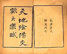 "Tiandi yinyang jiaohuan dalefu" (Chinese: 天地陰陽交歡大樂賦; pinyin: Tiāndì yīnyáng jiāohuān dàlèfù)[lower-alpha 1] is a Chinese rhymed prose poem (fu) on sexual intercourse attributed to Tang poet Bai Xingjian (776–826). Although it is considered a lost work, fragments of the poem were discovered as part of the Dunhuang manuscripts by Paul Pelliot in 1908 and first published by Ye Dehui in 1914.