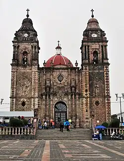 Santiago Tianguistenco (Spanish: [sanˈtjaɣo tjaŋɡisˈteŋko] ⓘ), often simply called Santiago by locals, is a city located in Mexico State about thirty km south of the state capital of Toluca. It is the municipal seat for the municipality of Tianguistenco. It is located in the southwest part of the Valley of Toluca at the edge of the Ajusco mountain range that separates it from Mexico City.[1] The name Tianguistenco (Tyanguistengko) is from Nahuatl and means “at the edge of the tianguis,” which is a traditional Aztec market. (Santiago comes from the town's early Spanish name of “Villa de Santiago.”) The section of the city where the industrial park is still bears this name.[2] Historically, the area was known as having one of the richest and best-stocked markets in the Toluca Valley. Today, it is still home to a large permanent municipal market as well as a weekly tianguis that covers much of the historic center.[1]