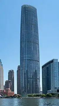 The Tianjin Tower,[5] or Jin Tower (Chinese: 津塔; pinyin: Jīntǎ),[4] or Tianjin World Financial Center (Chinese: 天津环球金融中心; pinyin: Tiānjīn Huánqiú Jīnróng Zhōngxīn) is a modern supertall skyscraper located in the Heping District of Tianjin, China, on the banks of the Hai River.[6] The mixed-use tower is 336.9 meters (1,105 ft) tall and contains 74 floors above ground and 4 below,[3] with an observation deck at 305.2 meters (1,001 ft). The area of the glass unitized curtain wall, manufactured by Jangho Group, is 215,000m².[2] It is notable as the first office building in Tianjin to be equipped with double decker elevators.[1]