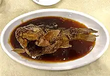 Zeng beng carp, or sweet and sour carp, is made with deep-fried carp with scales. It is named because the shape of the fish in the dish looks lively like struggling and jumping in a Zeng net (罾网).[14] The carp is first marinated with a series of blended seasoning, then it’s placed in a Zeng, a type of bamboo basket designated for fishing, and immerse the Zeng in a wok full of steaming-hot oil, making the carp in the shape of Beng (leap and sizzle), and finally, the fish is served with heated sweet and sour sauce.[15] It is characterized by its crispy fish bones, tender meat, and the great signature taste of sweet and sour. Especially when the sauce is poured during the serving, the aroma is overflowing.[16] Traditionally, the sweet and sour sauce for Zeng beng carp is a joint of the various ingredients in Tianjin: Laochou (老抽, aged soy sauce), ginger, garlic, red and green pepper, Duliu vintage vinegar, Prickly Ash Oil (Sichuan Peppercorn Oil), etc.[15] As the hot fish absorbs the hot juice, the "squeaking" sound after the deep-fry is endless. The Se (Look), Xiang (Fragrance), and Wei (Taste) all combined to make the dish of Zeng beng carp especially interesting to eat. |