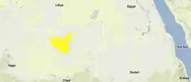 The ecoregion covers 82,200 square kilometers (31,700 sq mi) in the volcanic Tibesti Mountains of Chad and Libya, and 1932-m peak of Jebel Uweinat on the border of Egypt, Libya, and Sudan. The climate is arid and subtropical, but can reach 0°C at the highest altitudes during the winter. Rainfall is irregular but more regular than the surrounding desert and many of the lower wadis are watered by rain which falls higher up.[2]