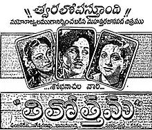 Tilottama is a 1951 Indian swashbuckling adventure fantasy film, produced and directed by Raja Saheb of Mirzapur under the Sobhanachala Pictures banner.[3] It stars Akkineni Nageswara Rao and Anjali Devi,[4] with music composed by P. Adinarayana Rao.[5] The film was simultaneously shot in Telugu and Tamil, with the latter being titled Mayamalai (transl. Mystic Chain). Tilottama was a box-office disaster.[6]