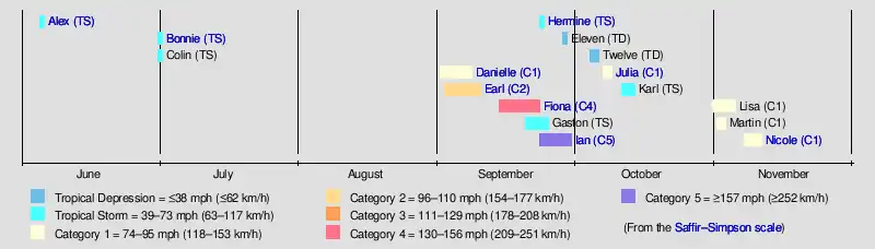 The 2022 Atlantic hurricane season saw an average number of named storms and hurricanes, and below average number major hurricanes (category 3 or higher on the 5-level Saffir–Simpson wind speed scale). There were fourteen named storms during the season; eight of them strengthened into a hurricane, and two of those reached major hurricane intensity.[1][2] The season officially began on June 1, and ended on November 30. These dates, adopted by convention, historically describe the period in each year when most subtropical or tropical cyclogenesis occurs in the Atlantic Ocean.[3] No subtropical or tropical development occurred in the Atlantic prior to the start of the season, making this the first since 2014 not to have a pre-season named storm.[4] The season's first storm, Tropical Storm Alex, formed on June 5, and the last, Hurricane Nicole, dissipated on November 11.