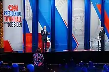 ![]() President Biden and Anderson Cooper at the CNN Town Hall while Biden is talking to Americans |
