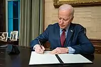 - ↑ Pramuk, Jacob (March 11, 2021). "Biden signs $1.9 trillion Covid relief bill, clearing way for stimulus checks, vaccine aid". CBNC. Retrieved March 12, 2021.