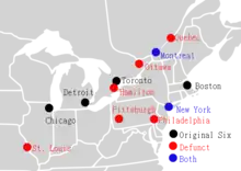 The National Hockey League came into existence with the suspension of the NHA in 1917.[6] After unsuccessfully resolving disputes with Eddie Livingstone, owner of the Toronto Blueshirts, executives of the three other NHA franchises—the Montreal Canadiens, Montreal Wanderers and Ottawa Senators—suspended the NHA, and formed the NHL, replacing Livingstone's team with a temporary team in Toronto, the Arenas.[7] While new, the NHL was a continuation of the NHA. The NHL adopted the NHA's constitution, its rules, playing with six men to a side rather than the then-traditional seven and the NHA's split-season schedule. The owners originally intended the NHL to only operate for one season. However, the NHA was suspended permanently in 1918 and ceased to be an organisation in 1920.[8] In 1921, the NHA championship trophy O'Brien Cup was adopted as the championship trophy of the NHL.[9]