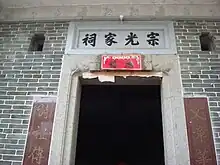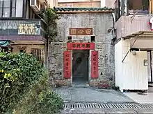 Historic buildings in the village include the Choi Ancestral Hall, also known as Chung Kwong Family Hall (宗光家祠), built around the 1920s,[7] the Leung Ancestral Halls (梁氏祠堂), two ancestral houses, largely rebuilt and occupied by tenants,[9][10] the Liu Ancestral Hall (廖氏祠堂),[7] and the Entrance Gate, built during the Qing Dynasty.[11] Two rectangular holes are above the front doorways of the Gate for feng shui benefit and for security watching.[4]