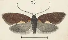 ♂♀. 18-19 mm. Head, palpi, antennae, thorax, and abdomen dark fuscous : patagiae tipped with whitish or ochreous ; antennal ciliations whorled, 3+1⁄2. Forewings elongate, costa moderately arched, apex rounded, termen slightly rounded, oblique : dark shining ferruginous with some ochreous admixture : a reddish-ochreous patch on dorsum at base ; a semi-oval ochreous patch, tinged with reddish and margined with white above, on dorsum at middle : cilia dark ferruginous. Hindwings dark fuscous : cilia dark fuscous with darker basal line. The single ♀ taken has the forewings entirely pale ochreous except that the median dorsal patch is indicated by a broad margin of ferruginous.[3]