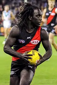 Following the many suspensions handed out to Essendon players at the end of 2015 for the supplements controversy fallout, McDonald-Tipungwuti was elevated to the Bombers' senior list.[5] He made his AFL debut in Round 1 of the 2016 season against the Gold Coast Suns at Metricon Stadium, and he retained his position in the team until his retirement. In July 2020, he broke the record for most consecutive AFL games for Essendon in the AFL era.[6] His streak ended at 126 games when he decided not to play in Round 22, 2021, due to personal reasons.[7]
