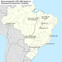 The movement was a precursor of left-wing armed struggle in Brazil[82] and one of the first attempts to start a rural guerrilla, an ambition that would only be effectively implemented with the Araguaia Guerrilla[83] and was already dreamed of by its future realizers, the PCdoB board of directors, in the founding of the party in 1962.[lower-alpha 6] The Peasant Leagues were also pioneers in sending militants to train in Cuba.[84] The MRT evidences that the armed struggle, considered a response to the 1964 coup d'état and the hardening of the military dictatorship with Institutional Act No. 5, was already considered by a part of the Brazilian left before these events.[lower-alpha 7] In this sense, it is comparable to the Tupamaros in Uruguay, who started their activities when the country was still democratic.[85]