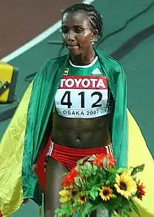 Tirunesh Dibaba (Oromo: Xirunesh Dibaabaa, Amharic: ጥሩነሽ ዲባባ ቀነኒ; born 1 October 1985[5]) is an Ethiopian athlete who competes in long-distance track events and international road races. She has won three Olympic track gold medals, five World Championship track gold medals, four individual World Cross Country (WCC) adult titles, and one individual WCC junior title. Tirunesh was the 5,000 metres (outdoor track) world record holder until 2020 when her compatriot Letesenbet Gidey set a new world record.[6] She is nicknamed the "baby-faced destroyer."[7]