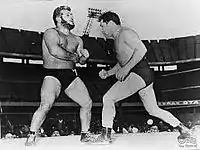 In 1950s Karadagián fought against former heavyweight champion Primo Carnera.[4] And in 1957 he maintained a wrestling match in the stadium of Boca Juniors, against former boxer José María Gatica, el mono.[5] That same year, Karadagian starred in Reencuentro con la gloria, movie where a wrestler ("Pantera") accidentally killed a rival during a fight.[6]