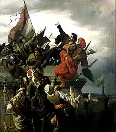From the end of the 18th century, with the forming of Hungarian national consciousness, the valiant soldier had been regarded as a national hero and role model. Imre Dugovics, a member of the Western Hungarian noble family of Croatian origin, took advantage of that.[4] In 1821, by means of three false documents, he attempted to verify that the anonymous fighter had been an ancestor of his family, called Titusz Dugovics. The name was made known to the public by Gábor Döbrentei, a recognised scholar of the period, who had been deceived by the false documents, and published them in study.[1] Thus, Titusz Dugovics and his story soon became (and have ever since remained) a part of Hungarian historical consciousness, although his name should not be considered more than early-19th-century fiction. The only element of the story that may be accepted as authentic is that of the unknown soldier described by Bonfini and Konstantin.[1]