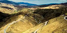 From November through March, snow can often fall on the pass, but it can be warm all year round in the strong sun.[1] It has been believed for a long time that it reaches an elevation of 2,260 metres (7,415 ft) above the sea level (this is also indicated on a sign at the top of the pass), but a gps-measurement by Hans Mülder on November 30 2022 indicated it is only 2,205 metres (7,234 ft) high,[2] which was confirmed by Google Earth, on which the highest altitude of the pass is 2,207 metres (7,241 ft). It is the highest major mountain pass in North Africa. The road was constructed along the old caravan trail by the French military in 1936,[3] and is now part of National Route 9 (formerly Route P-31).[4]