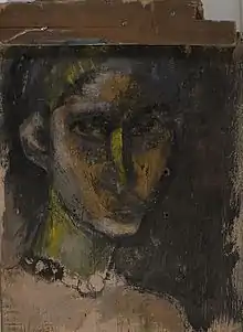 ![]() "Self portrait with beads" mixed media, gold leaf on wood sm 34X24,5 Fiesole, Italy, 2000 | |