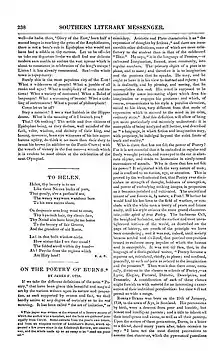 "To Helen" is the first of two poems to carry that name written by Edgar Allan Poe. The 15-line poem was written in honor of Jane Stanard, the mother of a childhood friend.[1] It was first published in the 1831 collection Poems of Edgar A. Poe. It was subsequently reprinted in the March 1836 issue of the Southern Literary Messenger. The final, revised version appeared in the 1845 collection The Raven and Other Poems.
