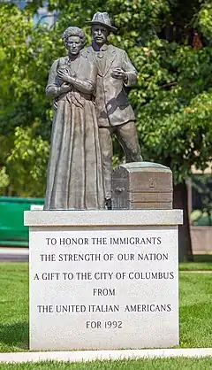 The artwork depicts an immigrant couple; the man carries a trunk and the woman holds an infant. It measures approximately 7 feet (2.1 m) x 4 feet (1.2 m), 5.75 inches (14.6 cm) x 3 feet (0.91 m), 6.5 inches (17 cm), and rests on a stone base measuring approximately 5 feet (1.5 m) x 64 inches (160 cm) x 4 feet (1.2 m), 4 inches (10 cm).[1] Inscriptions on the base include the artist's name, "To Honor the Immigrants / The Strength of Our Nation / A Gift to the City of Columbus / From / United Italian Americans / For 1992", and a list of names associated with the Columbus Italian Club.
