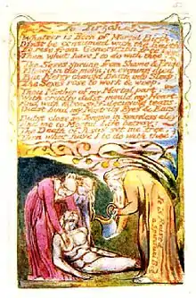 Blake's illustration to the poem depicts two women supporting a naked semi-supine male figure who appears to be unconscious or dead. An elderly man prepares to pour liquid from a jug over the figure. On the elderly man's clothing the words "it is raised a spiritual body" (1 Corinthians 15:44) are written.
