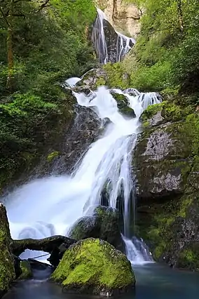 Toba Waterfall and Arsen Okrojanashvili Cave Natural Monument (Georgian: ტობის ჩანჩქერი და არსენ ოქროჯანაშვილის მღვიმე) is the highest in Georgia cascading waterfall of 234 m height and a karst cave complex located 5.6 km to the west from village First Balda (Pirveli Baldi) in Martvili Municipality, Samegrelo-Zemo Svaneti region of Georgia. [1] It is located at 707 metres above sea level on the left bank of Toba river, left-bank tributary of Abasha river and can be reached by marked hiking trail.[2]