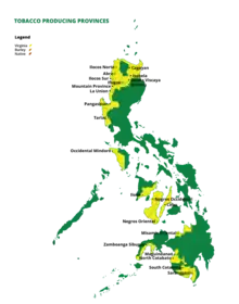 Native tobacco is grown in Region 1, Region 2 (Cagayan, Isabela, Quirino, and Nueva Vizcaya), the Visayan provinces of Cebu, Iloilo, Capiz, Leyte, and Negros Oriental, and the Mindanao provinces of Maguindanao, Zamboanga del Sur, Bukidnon, Misamis Ortiental, and North Cotabato.[4]