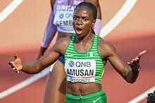 Oluwatobiloba Ayomide "Tobi" Amusan OON // ⓘ (born 23 April 1997)[4] is a Nigerian track and field athlete who specialises in the 100 metres hurdles and also competes as a sprinter. Amusan is the current world record holder in the 100 metres hurdles with a time of 12.12 seconds which she set at the 2022 women's 100 metres hurdles semi final in Eugene Oregon. She is the current Commonwealth and African champion in the 100 m hurdles, as well as the meet record holder in those two competitions. Amusan became the first ever Nigerian world champion and world record holder in an athletics event when she won the 2022 World Championships 100 m hurdles gold medal, setting the current world record of 12.12 seconds (+0.9m/s) in the semi-final, followed up by a 12.06 seconds (+2.5m/s) in the final. She won back-to-back Commonwealth and African titles in 2018 and 2022 in the 100 m hurdles and is also a two-time African Games champion in the event.[5][6] She is also the current Diamond league champion in the 100 metres hurdles having won the final in 12.33 seconds (+1.8m/s) achieving a winning streak in 2021, 2022 and 2023.
