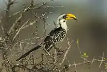 The eastern yellow-billed hornbill (Tockus flavirostris), also known as the northern yellow-billed hornbill,[1] is a species of hornbill in the family Bucerotidae. It is found in Djibouti, Eritrea, Ethiopia, Kenya, Somalia, South Sudan, Tanzania, and Uganda. It resembles the southern yellow-billed hornbill, but has blackish (not pinkish) skin around the eyes.