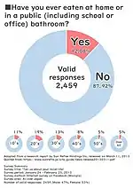 • In a survey conducted by home renovation company SunRefreHoldings in 2013, out of 2,459 valid responses, 12% had eaten in a public restroom at home, school, or work. Of these same responses, 19% said they had eaten toilet meals in their 20s, 13% in their 30s, and 11% in their teens. Notably, 80% of women in their twenties stated they had eaten a "toilet meal", many of them in public restrooms.[11][2]