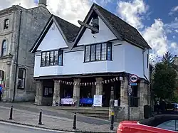 The Tolsey was designed in the Tudor style, built using half-timbering techniques and was completed in 1520.[6] Surveys using dendrology have dated the timbers back to 1525[7] although the first documented reference to the building was not until 1561.[8] The building was raised on stone pillars so that markets could be held, with an assembly room on the first floor.[9] The design involved a symmetrical main frontage with two bays facing onto the High Street; the first floor was fenestrated by bay windows and surmounted by gables. The ground floor was the place for wool merchants to meet in medieval times. Tolls for the use of the market facilities and taxes were also collected on behalf of the lord of the manor. The assembly room was used as a venue for borough court hearings and also operated as the local town hall.[7] The room was furnished with a chair, a table and a chest of drawers bearing the coat of arms of Burford Corporation.[10]