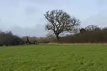 The site has been farmed since Domesday Book in the eleventh century, and it was probably part of a high status manor in the Middle Ages. The hedgerows show signs of a ditch and bank next to them, and this together with ancient trees suggests that the hedges and layout of the fields pre-date the late eighteenth-century Enclosure Acts. The landscape has changed little in the last 150 years. The fields are currently managed as neutral hay meadows. The northern field is damp and has plants typical of periodically waterlogged fields, such as creeping bent and marsh foxtail. Mammals on the site include woodmice, field voles and roe deer.[3] The wildlife has increased considerably over the years, it is regularly visited by little white egrets, herons love the water and the waterlogged field for frogs and lizards. There are several pairs of Kestrels, Sparrow hawks can be seen working the trees. A pair of Buzzards, Red Kites have been seen on a regular basis. A trip over the fields late in the evening will reward with several Tawny owls calling to each other, and numerous bats flying around. In 2017 a Jersey Tiger Moth was recorded resting on a bush. There is a very large array of Butterflies and moths. There is access from Kingston Road near Jubilee Way.