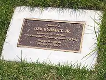 Every May, Oak Grove Middle School students volunteer for a Thomas Burnett Day of Service. At Jefferson High School, Burnett's former teammates created a memorial to honor him situated between two football practice fields. The school's hallways display photos of Burnett and his jersey,[5] which was retired on September 5, 2002, at Bloomington Arena during the game between Bloomington Jefferson and their rival, Bloomington Kennedy. A memorial scholarship was started in his honor, and a collection of his favorite books was placed in the school's media center. A white oak tree was planted in front of Saint Edward's Catholic Church in Bloomington, where Burnett was confirmed, and where his funeral was held. A large fieldstone in front of the tree is inscribed with the passage from the Book of John 15:13: "There is no greater love than to lay down one's life for one's friends".[4]