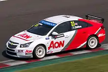 Chilton moved to RML for the 2013 season, driving a Chevrolet Cruze 1.6T alongside former world champion Yvan Muller.[17] He finished second behind Muller at the season opening Race of Italy[18] He took his first WTCC pole position at the Race of the United States, beating teammate Muller.[19] From pole he held off Tiago Monteiro to claim his first race win in the World Touring Car Championship. During the final race of the season, the 2013 Guia Race of Macau, Chilton dropped out with exhaust problems but not before being involved in the accident that caused the second red flag of race 2, as Eurico de Jesus hit him and under the subsequent safety car multiple drivers barreled into each other at the scene to cause the red flag.