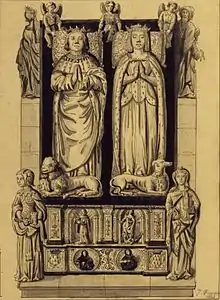 The monument consists of a rectangular sarcophagus 3.90 m long, 2.33 m wide, and 1.27 m tall.[1] The gisants (recumbent effigies) of the deceased couple are lying prostrate with hands raised in prayer. Their heads rest on thick pillows held up by three angels. Margaret's feet are on a greyhound, a symbol of fidelity; Francis's feet rest on a lion, representing strength. At the four corners of the tomb stand four statues, each representing one of the cardinal virtues: Courage, Justice, Temperance and Prudence.