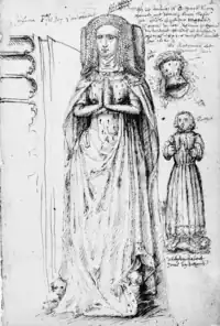 Today it is known through a number of drawings and written descriptions, the most detailed being from Charles de Rietwyck's 1600 'Sigillographica Belgica' and in 1602 in Antoine de Succa's nl "Memoriaux". Succa also made notes, describing elements such as her blond hair and the coat of arms on her cloak.[6] De Rietwyck's notes detail that at the time, the tomb was positioned in the middle of the church's choir, that its epitaph was engraved on copper, and that it was 4 feet high, 10 feet long and 8 feet wide.[7]