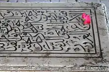 The central vaulted chamber of the tomb contains a marble platform with two cenotaphs, one that commemorates Nur Jahan and the other to commemorate her daughter, Ladli Begum. Built by Hakim Ajmal, Khan of Delhi in 1912, the original marble sarcophagus bears ornate workmanship and the name of Allah, in the same style and size as seen in the tombs of Jahangir and Asif Khan. On her tomb is inscribed an epitaph: "On the grave of this poor stranger, let there be neither lamp nor rose. Let neither butterfly’s wing burn nor nightingale sing".[10]