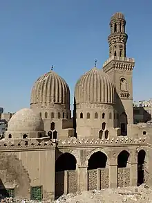 The building features a covered courtyard and the iwan of the qibla. The second door leads to an arch with cross-vaulted arches. On its right are two large domes, identical in style, the dome over the tomb of Sayf al-Din Salar being larger than the second. The smaller one belongs to Sanjar al-Jawli.[6] These two domes are built from hardened brick, and at the end of the aforementioned path is a smaller dome made out of stone, built over the tomb of a Sufi shaykh, Sidi Abdullah al-Zakir. This dome is regarded as one of the earliest examples of stone domes in Cairo.[7]