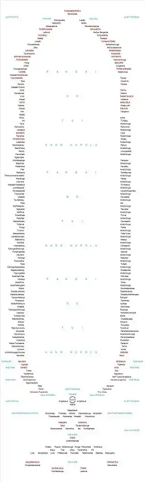 Kava also plays a very important role in the origin story of the Tu’i Tonga line of kings,[3][7] Tonga’s first and most sacred line that is said to have controlled a vast Oceanic empire. The Tu’i Tonga line is the progenitor of most Tongan chiefly and noble titles, and even the current ruling house of Tupou can trace their lineage to this senior line. In short, a half-human, by his mother 'Ilaheva Va'epopua, and half-god man named ‘Aho’eitu ascended a great toa tree in search of his father, one of the great sky-gods, Tangaloa ‘Eitumatupu’a. In his search, he happened upon Tangaloa and it is said that he partook of kava with Tangaloa. During his stay in langi, the abode of Tangaloa, where many researchers claim is the sky or even Manu’a, Samoa,[7] ‘Aho’eitu had met and bested his five older brothers in an array of sports. ‘Aho’eitu immediately became the favorite amongst his siblings and out of jealousy, his older brothers led by the eldest, Talafale, killed ‘Aho’eitu, throwing his head into a hoi bush and disposing of the body by eating it. After searching for ‘Aho’eitu, Tangaloa ‘Eitumatupu’a inquire of his five sons and knew what they had done and commanded that a great tāno’a or kumete, kava bowl, be brought to him in which he commanded the five to throw up the remains of ‘Aho’eitu. After they had done so, Tangaloa ‘Eitumatupu’a had covered the kava bowl with leaves of the nonu (noni) tree and ‘Aho’eitu miraculously was brought back to life. It is proclaimed by Tangaloa ‘Eitumatupu’a that ‘Aho’eitu would return to maama, the world and Tonga, to become the Tu’i Tonga, paramount chief/king of Tonga, and his five older brothers would go with him to serve their younger brother and protect him. The eldest of the five, Talafale, became Tu’i Faleua, king of the second house, for if ever ‘Aho’eitu’s line should die out, Talafale and his descendants would then rule. Today the Noble Tu’i Pelehake is the line descendant from Talafale. The other four brothers became the heads of the kau Falefā, the four houses, tasked with specific duties in protecting and providing for 'Aho'eitu and the Tu'i Tonga line.[8]