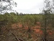 Areas associated with semi-permanent water support shallow freshwater sedgelands.[3] Bimble box grows in periodically flooded depressions on sandplains and alluvial plains.[3] On dryland areas there are extensive woodlands of belah, black oak, western rosewood and leopardwood.[3] A relatively large expanse of Whitewood–Western Rosewood low woodland occurs on the stony tablelands.[3] There are small patches of supplejack dominated woodland and Western Peneplain woodlands dominated by coolibah and beefwood or ironwood.[3] Gidgee and occasionally Whitewood tall shrublands, mulga (Acacia spp.) communities and Aeolian dunefields comprising patches of gum coolibah woodland also occur.[3]