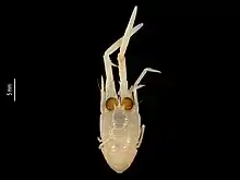 Males measure 5.8–9.5 mm (0.23–0.37 in) and females 4.1–8.1 mm (0.16–0.32 in) in postorbital carapace length.[lower-alpha 1] The body and the appendages are whitish. The carapace has some yellowish bands on the gastric area and on the posterior and lateral margins.[2]