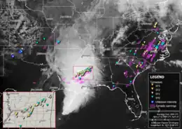 As the SPC introduced a day 5 threat area across the Central United States valid on April 17, the organization also outlined a large day 6 region across portions of the Midwestern states, Mississippi Valley, and Appalachia.[2] A day 3 Slight risk was originally introduced from the central Gulf Coast north into southern Illinois, but a rare mid-afternoon update outlined an Enhanced risk across eastern Louisiana into southern Mississippi.[9] It was later expanded eastward to encompass much of Alabama as well as the Florida Panhandle.[10] In their 16:30 UTC update on April 18, the SPC contemplated upgrading portions of the risk area to a Moderate risk (driven by the chance for tornadoes), but ultimately deferred due to questions surrounding the characteristic of expected storms.[11] As the aforementioned, well-defined shortwave trough progressed eastward into the lower Mississippi Valley, a mesoscale convective vortex organized over west-central Mississippi.[12] Embedded circulations and semi-discrete supercell structures within this complex led to 44 confirmed tornadoes, the strongest of which caused high-end EF2 damage in Morton, Mississippi.[13] This ties the Hurricane Rita tornado outbreak as the largest outbreak in Mississippi state history.[14] As the squall line tracked east, numerous reports of damaging wind gusts were received across the Southeast United States.[15]