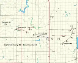 F1 NE of Leola to NW of Barnard McPherson, Brown SD 00:32–00:43 5 mi (8.0 km) 500 yd (460 m) A barn was destroyed, a farmhouse was damaged, and many trees were downed in McPherson County. No damage was recorded in Brown County.[3]