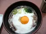 Tororo (Japanese: 薯蕷, とろろ) is a Japanese side dish made from grating raw yams such as yamaimo or nagaimo. Usually flavorless, ingredients that can be mixed with it can be wasabi, dashi, and chopped spring onions, to give it more flavor.[1]