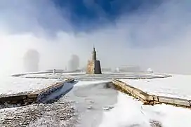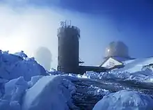 Torre is the culminating point of the Serra da Estrela range and as such tends to present the lowest temperatures and highest precipitation levels. The climate is defined as a transition between the typical Mediterranean climates seen south of the range and the not-so-typical oceanic climates found north of the range. Precipitation is very high, with around 2,400 mm (94 in), but when compared to lower valley regions of the range, rain is rather weak and continuous.[1] Snow can occur anywhere between October and May, mostly in February, but can be irregular.[2][3]