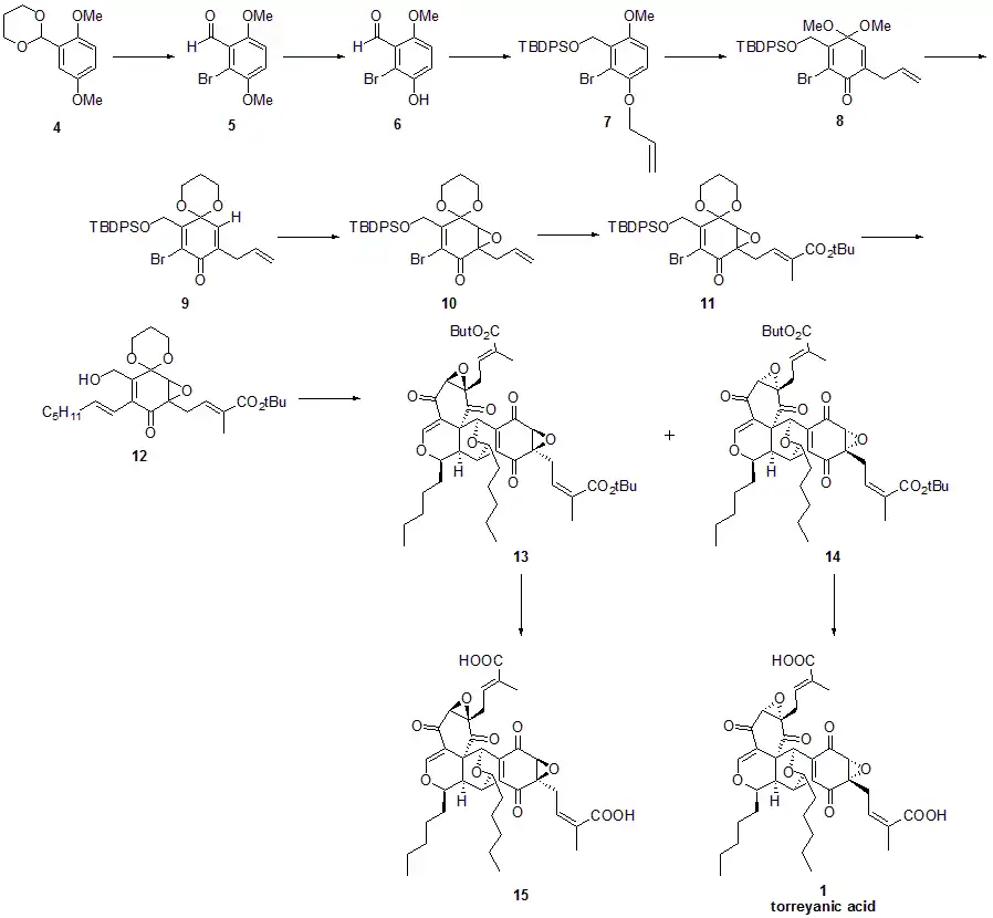 The first total synthesis of torreyanic acid was reported by Porco an co-workers in 2000.[3] This total synthesis aimed to employ and confirm the Diels–Alder genesis proposed by Lee et al.[1] To synthesize the monomers required for Diels–Alder dimerization, 1,3-dioxane intermediate 4 was lithiated with BuLi, brominated with BrCF2CF2Br, and underwent acid hydrolysis to afford benzaldehyde 5. Upon selective methylation of 5 with sulfuric acid, phenol 6 was produced in 52% yield. Phenol 6 first underwent an allylation with allyl bromide, then a borohydride reduction, and finally a protection with a silyl group to furnish 7. Dimethoxyacetal 8 was furnished upon thermal Claisen rearrangement of 7, which afforded an unstable allyl phenol that directly underwent a hypervalent iodine oxidation with PhI(OAc)2 in methanol. 8 was then subjected to an acetal exchange with 1,3-propanediol to afford 1,3-dioxane 9, which was smoothly monoepoxidized with Ph3COOH, KHMDS, −78 °C to −20 °C over 6 hours to afford 10. A 2-methyl-2-butenoic acid moiety was installed to afford 11. Intermediate 11 underwent a Stille vinylation with (E)-tributyl-1-heptenyl stannane, subsequently subjected to TBAF/AcOH for silyl removal and acetal hydrolysis to afford quinone epoxide 12. Treatment of 12 with Dess-Martin periodinane initiated a tandem oxidation-6p-electrocyclization-dimerization to afford two dimeric products 13 and 14. Upon treatment of 13 and 14 with TFA to remove the tert-butyl ester, iso-torreyanic acid 15 and torreyanic acid 1 were afforded, respectively.[3]