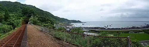 There is no station building. The station, which is unmanned, consists of a single side platform serving a single line and is located on an embankment high above the adjacent main road and buildings. A ramp from the main road leads to a shelter for waiting passengers which is located on a lower level. Steps from the shelter lead up to the platform which is thus not wheelchair accessible. There is no shelter on the platform itself. The station is a designated evacuation area in the event of tsunamis.[5][6] [7]