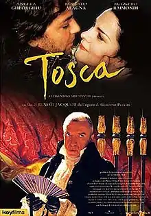 Tosca is a 2001 musical drama film written and directed by Benoît Jacquot, closely based on the 1900 opera Tosca with music by Giacomo Puccini and an Italian libretto by Luigi Illica and Giuseppe Giacosa, based in turn on the 1887 play by Victorien Sardou. The film stars soprano Angela Gheorghiu, tenor Roberto Alagna, and baritone Ruggero Raimondi, who mime their parts, sung in Italian. The soundtrack was pre-recorded in 2000 with the Royal Opera House orchestra and chorus conducted by Antonio Pappano.[1][2]